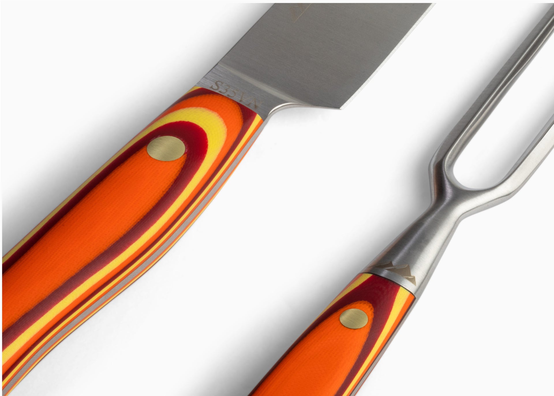 The distinctive shape, balance, and thickness of the carving knife will elevate your feast with elegant slicing. The sharp tip helps maneuver around bones while the extra-thin blade cleanly slices even the most delicate meats. Nine inches is the perfect length for long, single strokes while the harpoon clip-point on the top of the blade makes a fitting homage to New West’s Western roots. The forged, bayonet-fork has a full-sized, ergonomic G10- handle designed for durability and leverage to carve proteins large and small.