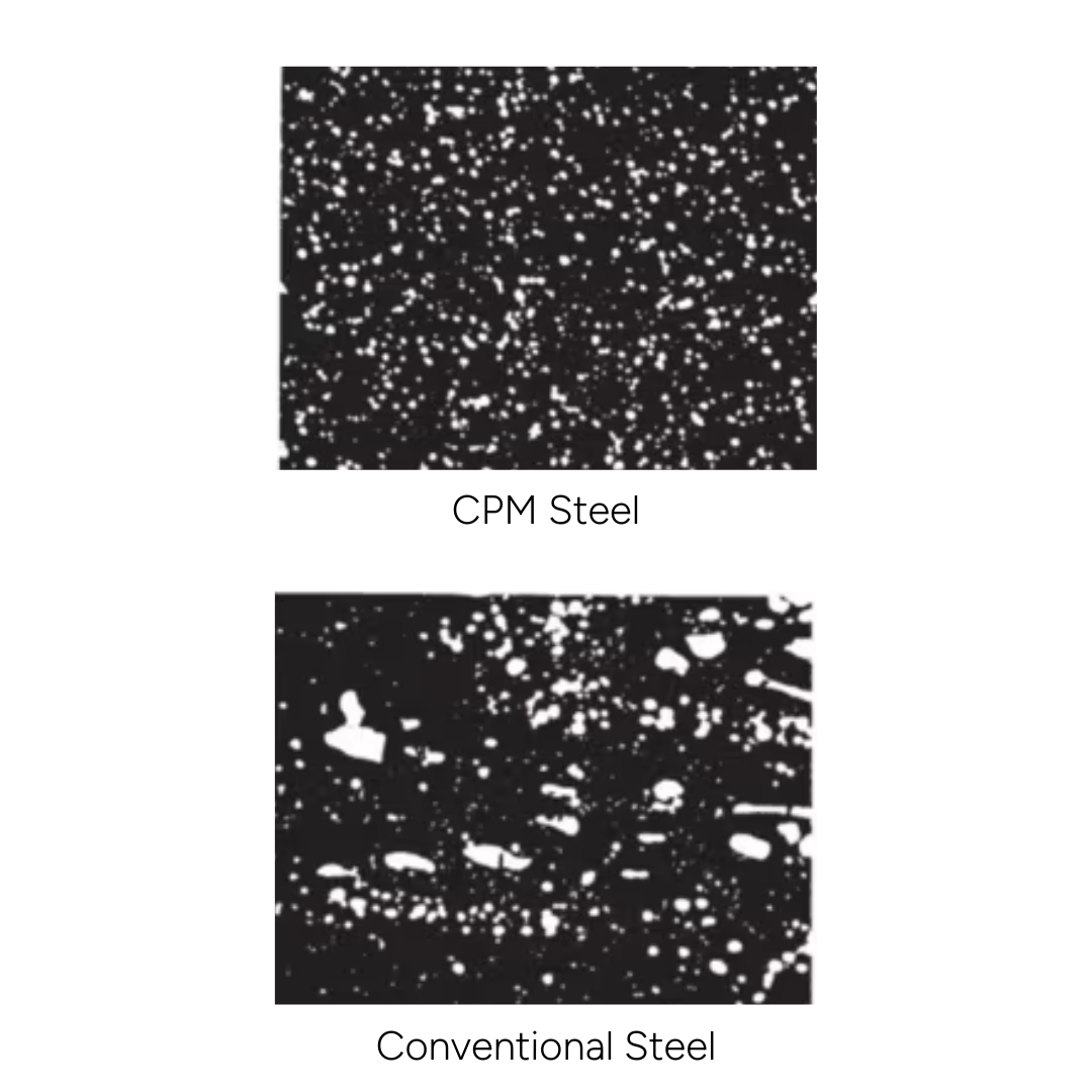 Different amounts of alloys in steel give it its different characteristics. The CPM process allows steel to have higher alloy content than tradition wrought steels like VG10 and Wusthof Trident steel. Also because of the drastically smaller grain size, carbides formed in the steel making process have greatly improved performance. Larger carbides formed in traditionally wrought steels can lead to difficulty in sharpening and increased brittleness. While the harder, carbide rich, micro-structure of the CPM steel allows for both superior edge holding while still allowing for ease of sharpening and creation of an incredibly fine edge.