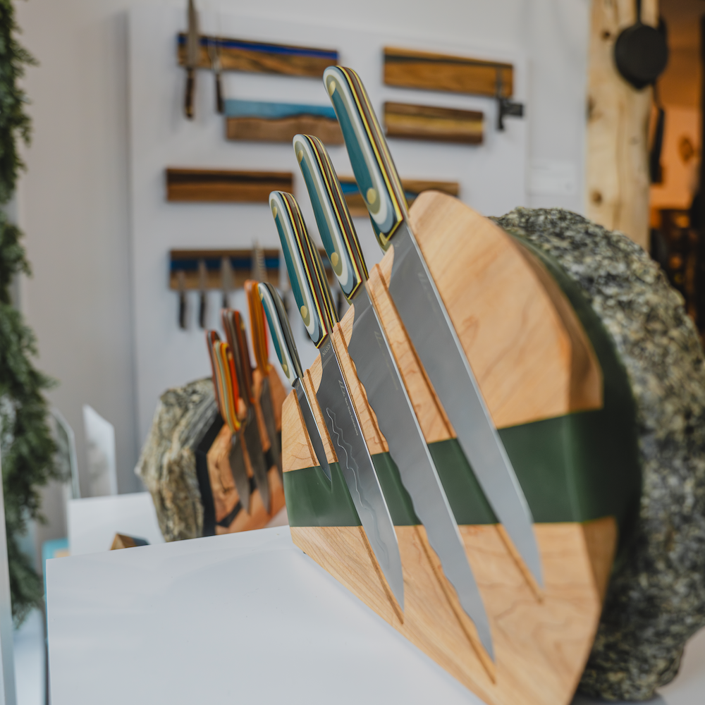 New West Knifeworks in Big Sky provides beautiful, professional quality chef knives, steak knives, hunting knives, pocket knives, hand-forged kitchen knives, and artisan made knife blocks. Knife sharpening is available in our Big Sky knife store using cutting edge tools and techniques to make knives sharper than ever. Described by Bon Appetit as “the ultra-giftable knife”, New West offers laser engraving and also specializes in unique options for corporate and client gifting as well as unique wedding registries. New West knives are guaranteed for life and come with lifetime service for maintenance and sharpening.
