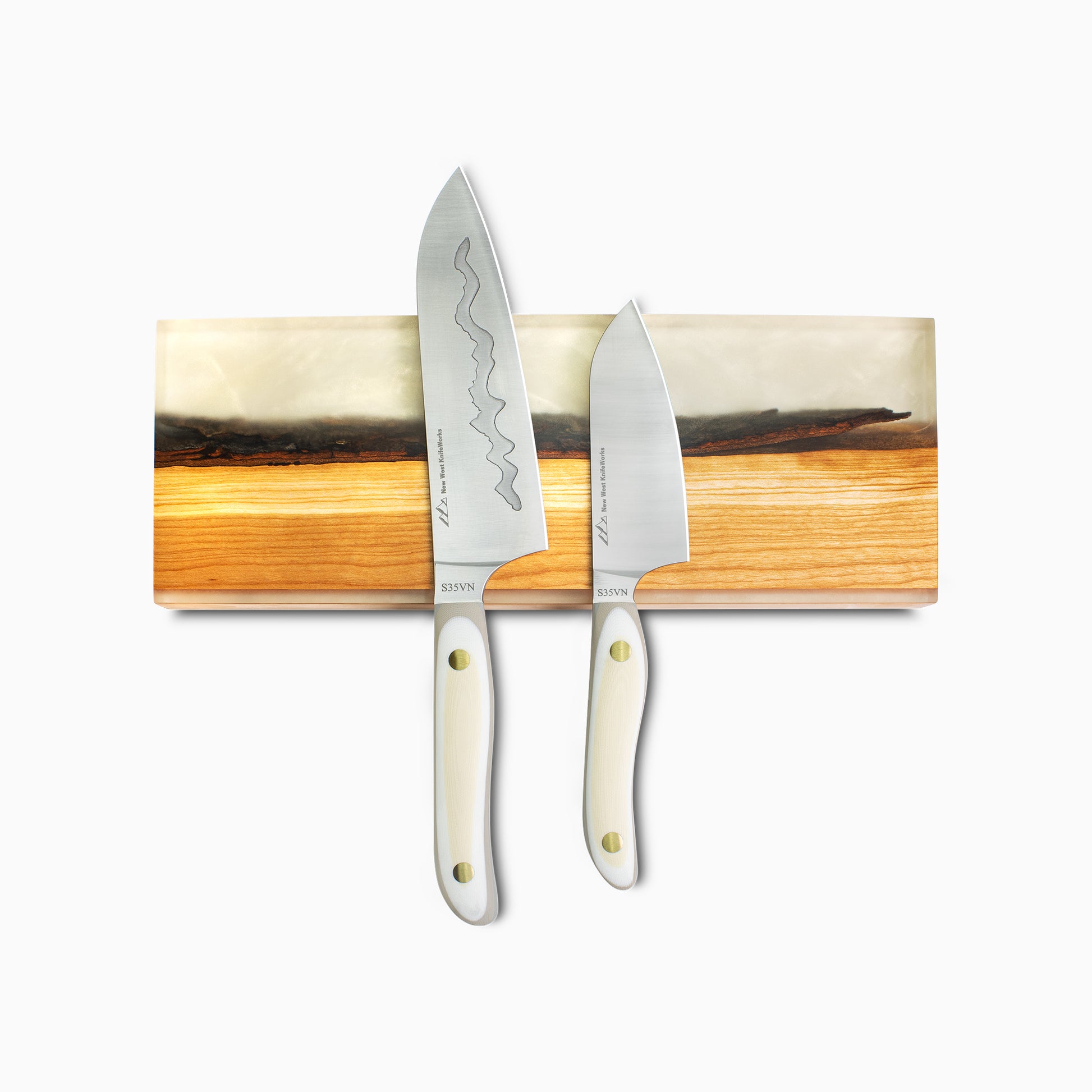 New West KnifeWorks Head of Production, Erin Hemmings, has mastered the art design of mixed media with these magnets. Combining rich, natural wood grain with the vibrancy of cast resin, these knife magnets provide a natural look and feel to your kitchen. This one-of-a-kind magnet can securely hold up to 9 knives on the super-strong magnets encased within.