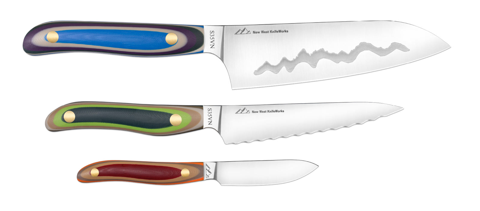 A Full size, mid-size, and detail work knife-- more than just a starter set, this set covers every size job with precision and style. Teton Edge Santoku, Deli Knife, and Paring Knife. Chop, slice, dice, bone, pare, and core with this set. You'll never give your old knives a second thought.