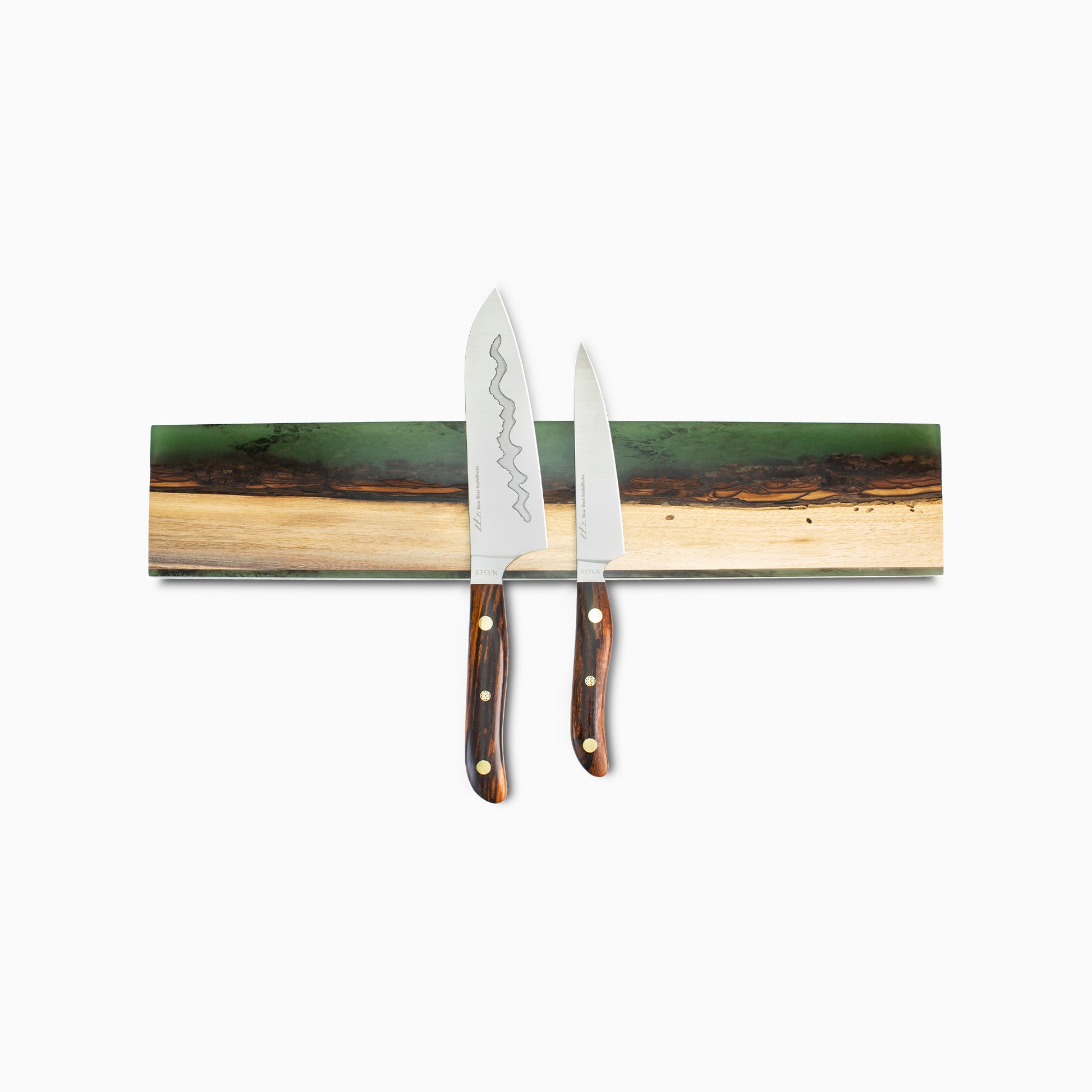 New West KnifeWorks Head of Production, Erin Hemmings, has mastered the art design of mixed media with these magnets. Combining rich, natural wood grain with the vibrancy of cast resin, these knife magnets provide a natural look and feel to your kitchen. This one-of-a-kind magnet can securely hold up to 9 knives on the super-strong magnets encased within.