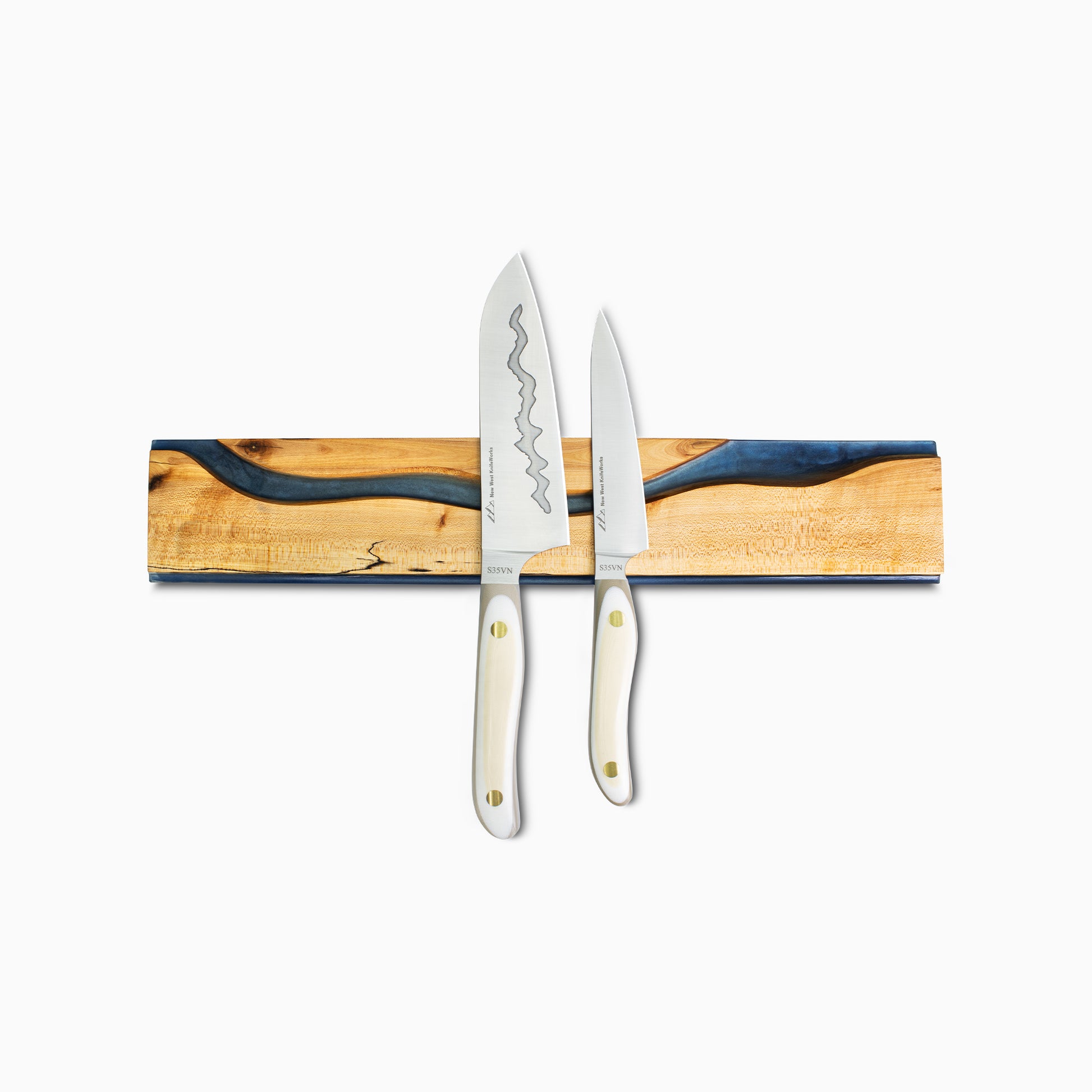 New West KnifeWorks Head of Production, Erin Hemmings, has mastered the art design of mixed media with these magnets. Combining rich, natural wood grain with the vibrancy of cast resin, these knife magnets provide a natural look and feel to your kitchen. This one-of-a-kind magnet can securely hold up to 9 knives on the super-strong magnets encased within.