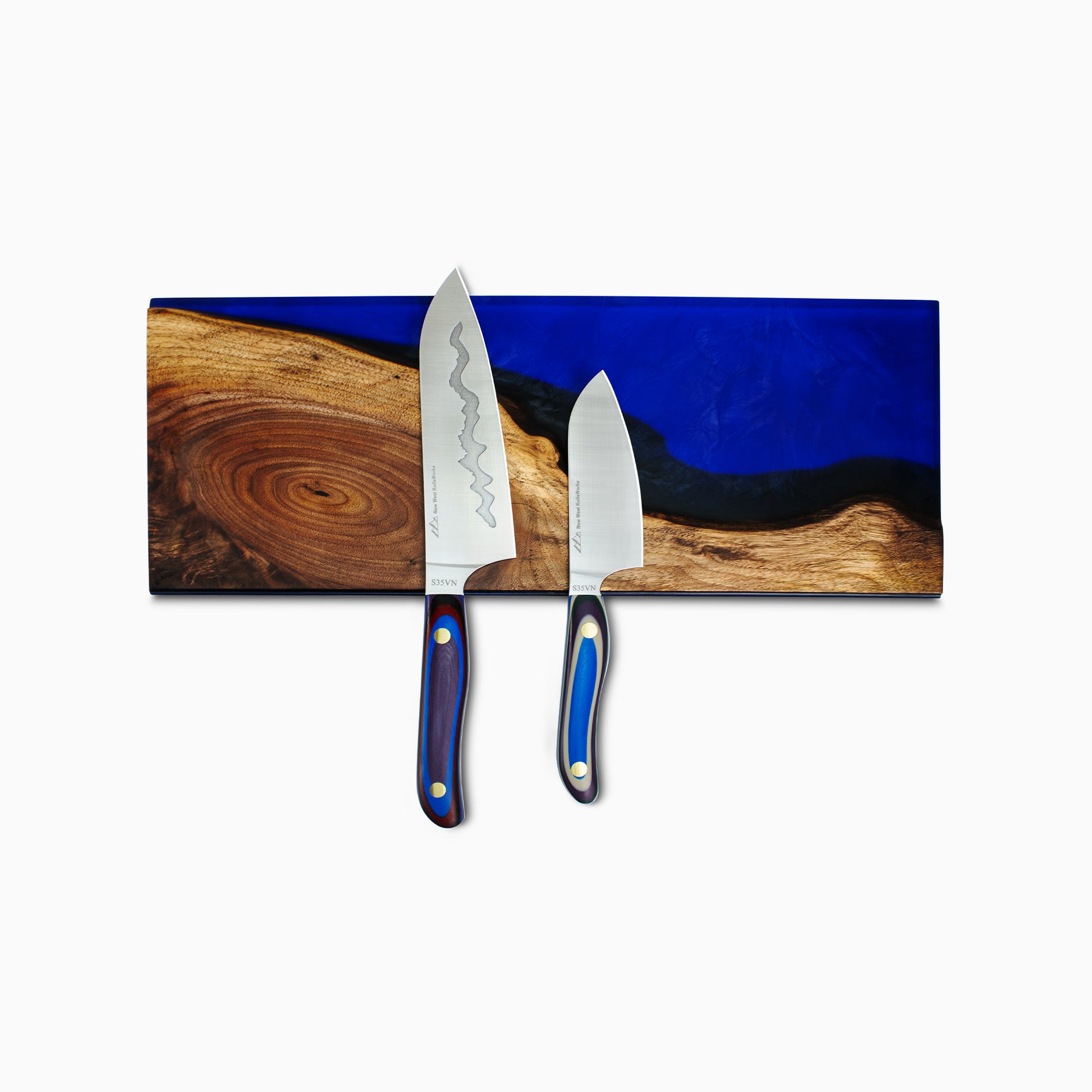 New West KnifeWorks Head of Production, Erin Hemmings, has mastered the art design of mixed media with these magnets. Combining rich, natural wood grain with the vibrancy of cast resin, these knife magnets provide a natural look and feel to your kitchen. This one-of-a-kind magnet can securely hold up to 9 knives on the super-strong magnets encased within.