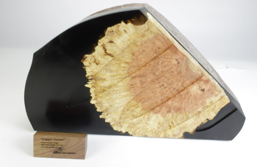 Materials: Amboyna Burl Wood, Aluminum, Red Granite Rock, Black Resin