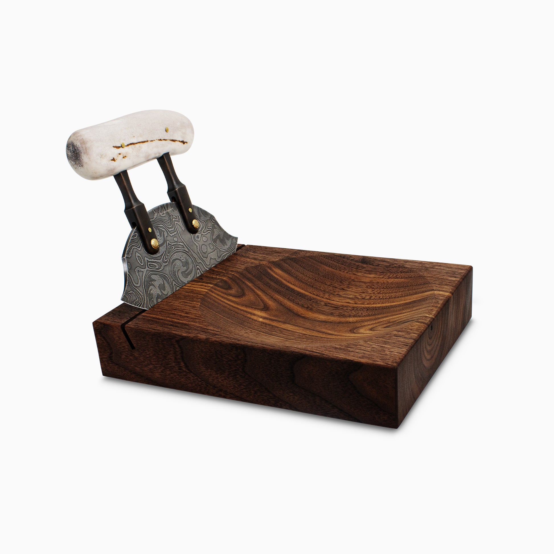 A handle of naturally shed elk antler is accented with a bronze bolster and bronze pins, creating an earthy, elegant contrast to the flowing damascus lines of the blade. The knife is seated in a matching block with a sculpted bronze attachment plate, designed to honor the form and function of traditional Ulu knives while elevating it to a display-worthy centerpiece.