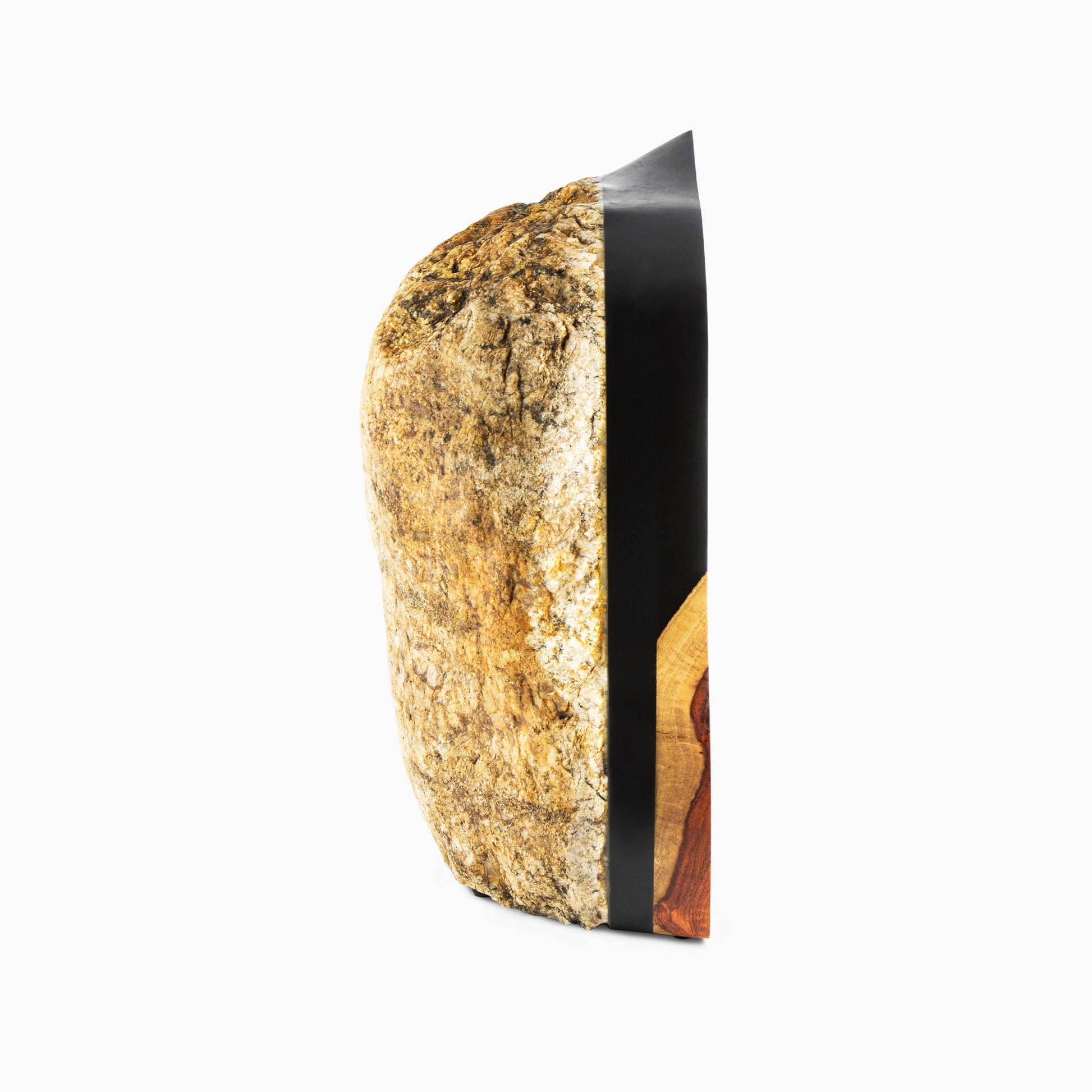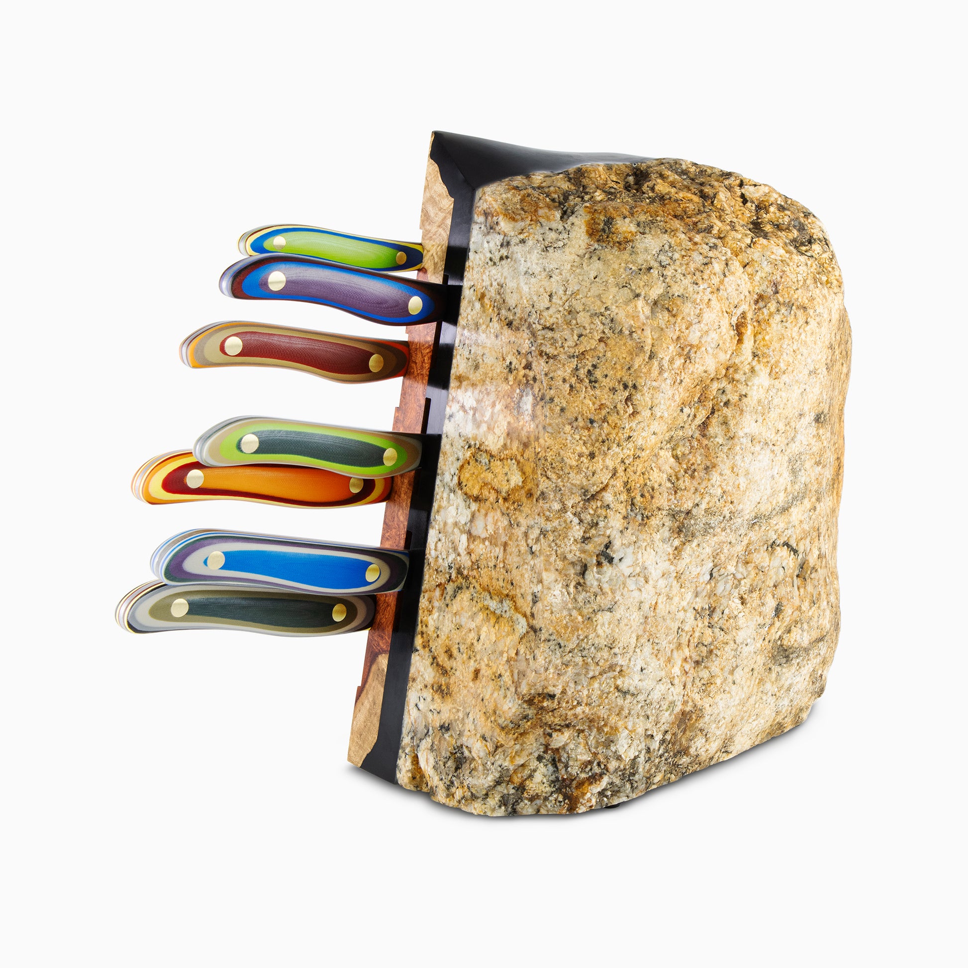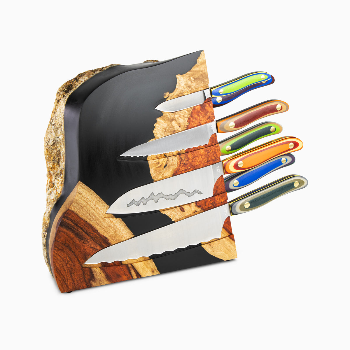 This rock block is specifically designed to hold 7 New West KnifeWorks Chef knives. All knives are resting in fitted wooden slots. Made with Amboyna Burl, Speckled River Rock, and Black Resin.