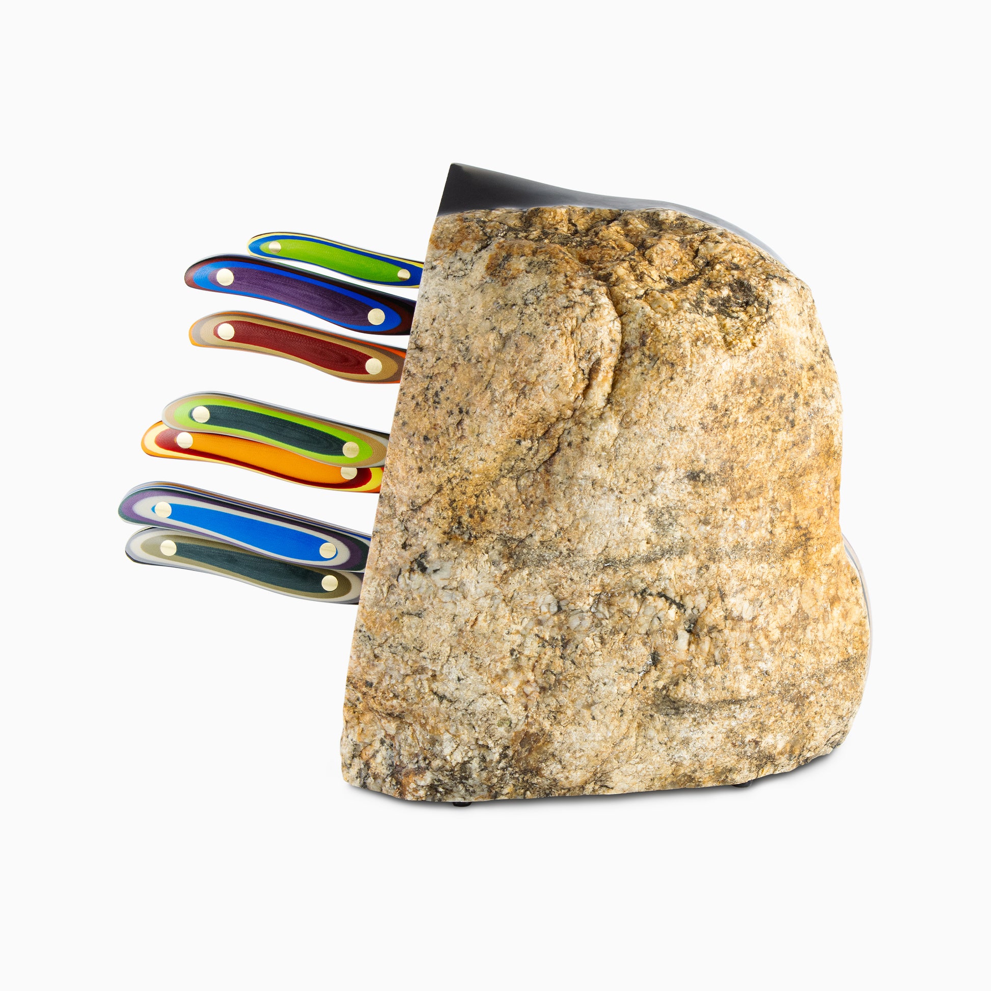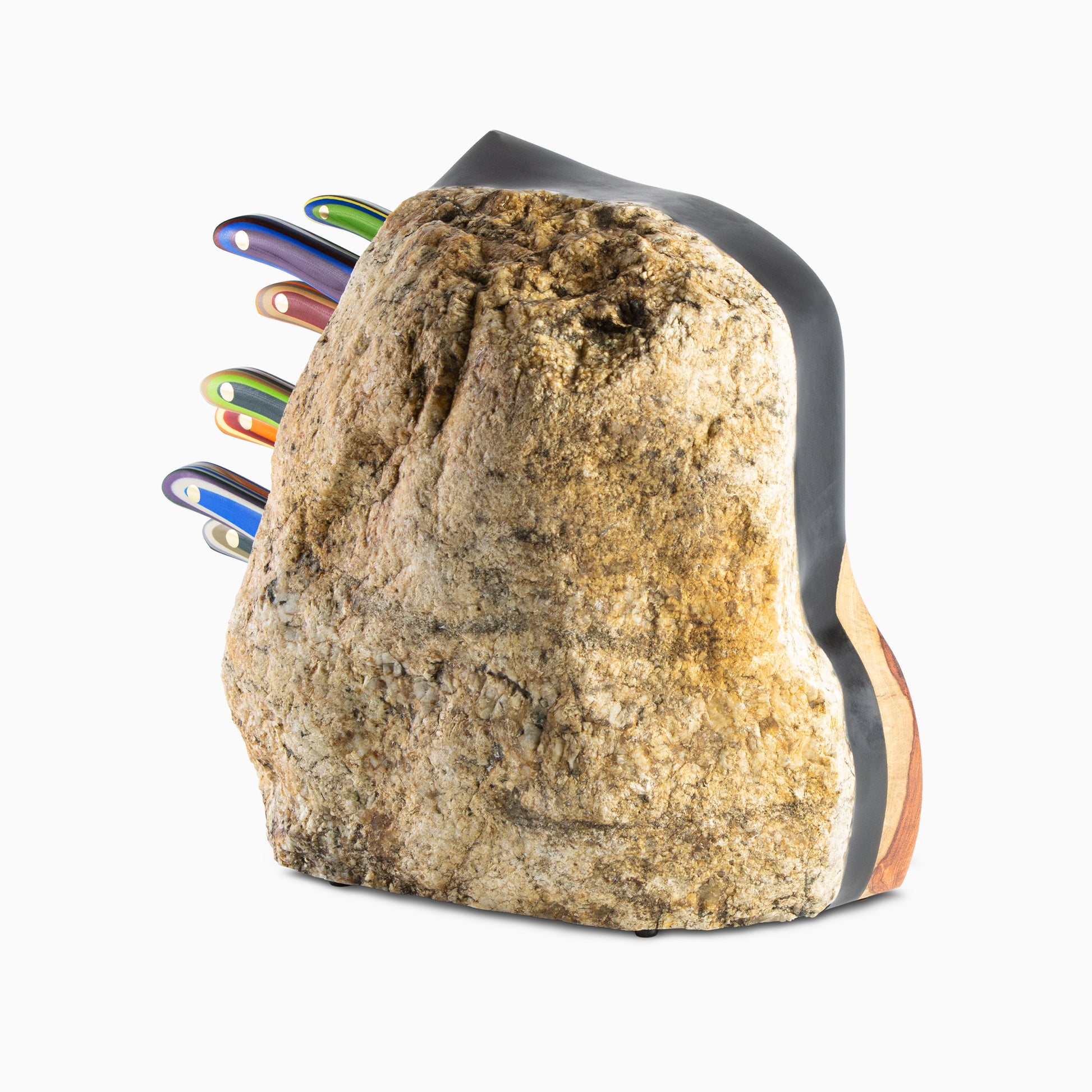 Harvested directly from the local Snake River, these stones are all quartz-based variations of granite. Each rock is chosen by hand and then cut using an 18" diamond saw that Erin Hemmings, New West KnifeWorks' Head of Production, conceived and built specifically to create our unique Rock Blocks. In this process, the saw uses gravity to lower a swing arm into the stone while the stone is rotated. Through much research, we have found no similar saw or process in existence - nor knife blocks that exhibit such power and beauty.