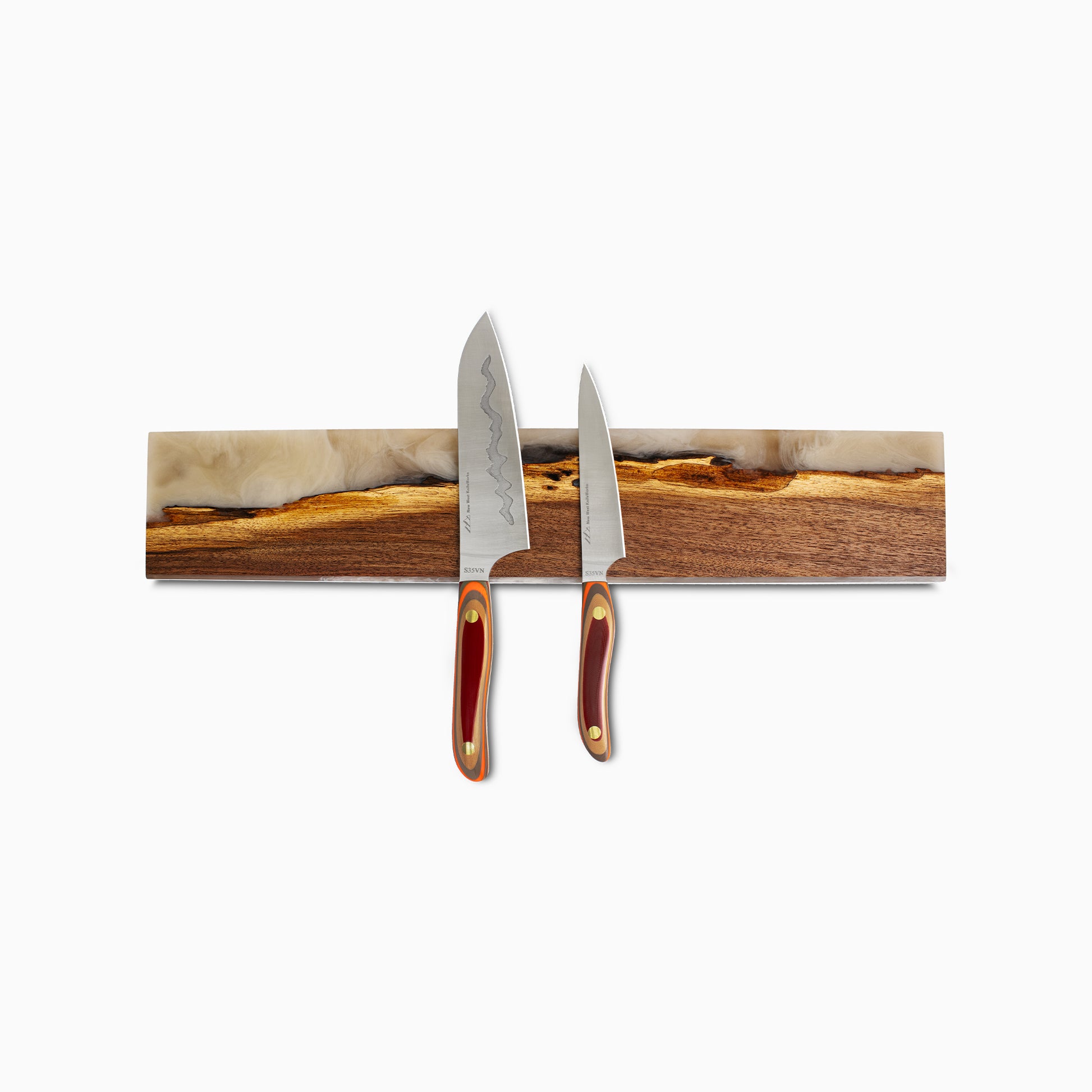 New West KnifeWorks Head of Production, Erin Hemmings, has mastered the art design of mixed media with these magnets. Combining rich, natural wood grain with the vibrancy of cast resin, these knife magnets provide a natural look and feel to your kitchen. This one-of-a-kind magnet can securely hold up to 9 knives on the super-strong magnets encased within.
