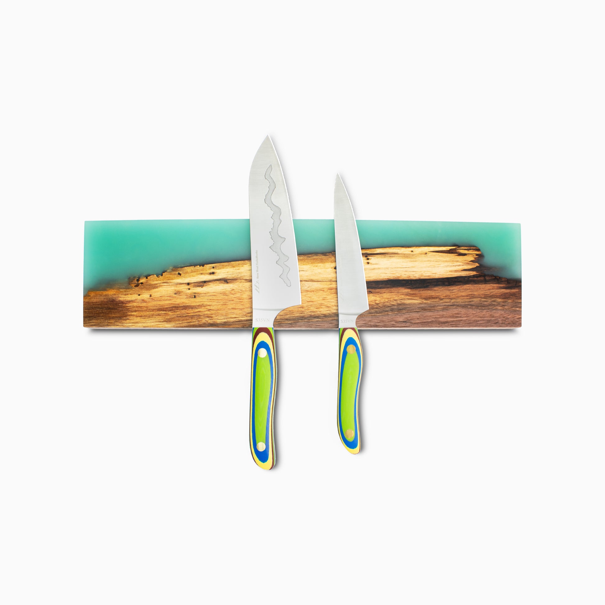 New West KnifeWorks Head of Production, Erin Hemmings, has mastered the art design of mixed media with these magnets. Combining rich, natural wood grain with the vibrancy of cast resin, these knife magnets provide a natural look and feel to your kitchen. This one-of-a-kind magnet can securely hold up to 9 knives on the super-strong magnets encased within.