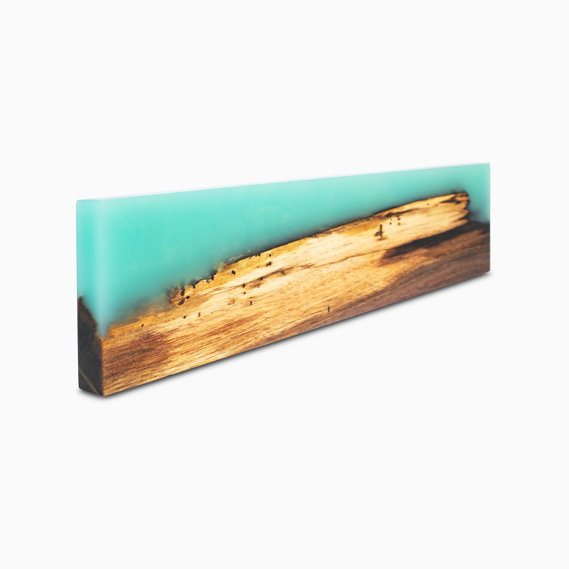 Discover the pinnacle of knife storage: a blend of artistic design and functionality. Meticulously handcrafted in the USA using Walnut wood and Aqua color epoxy resin.