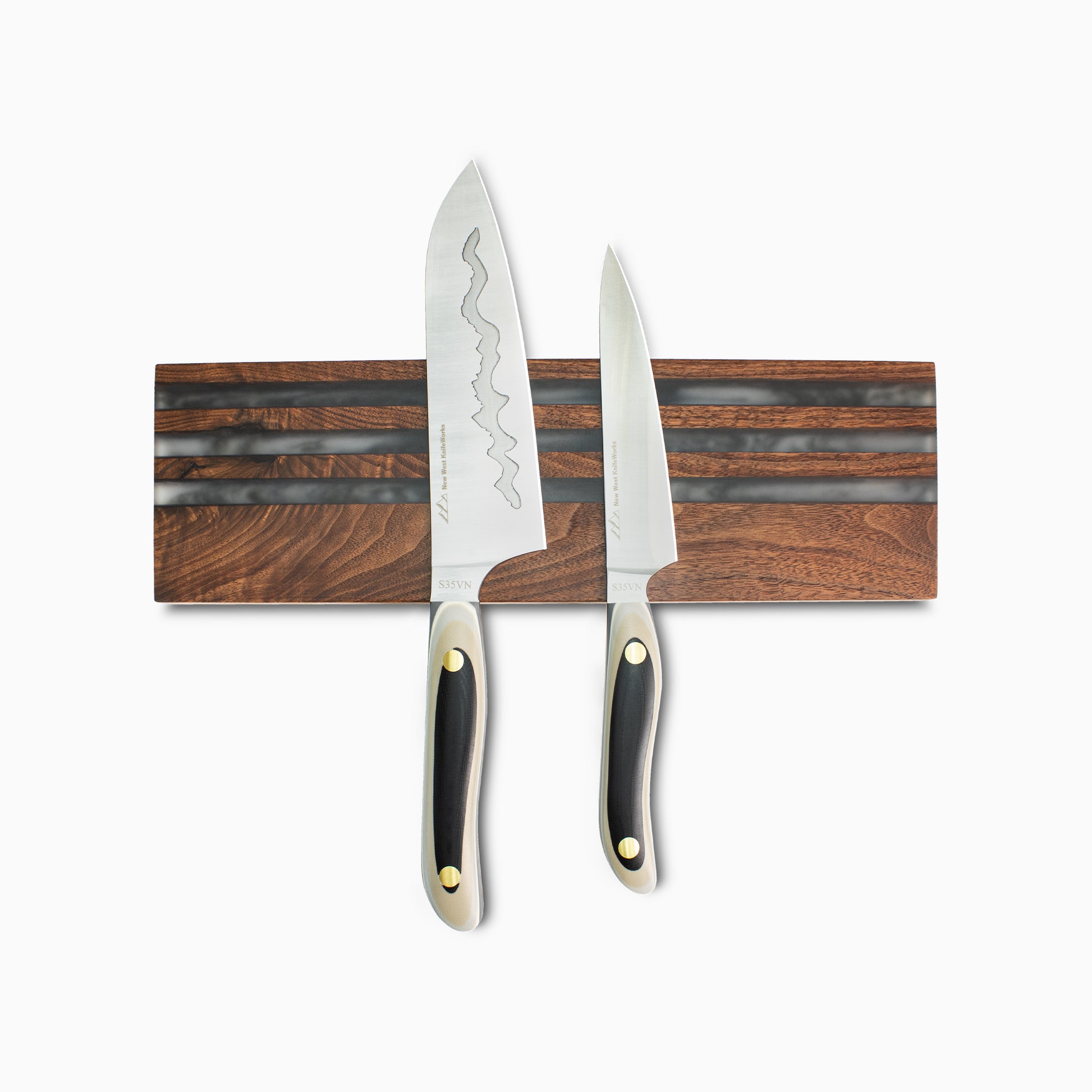 New West KnifeWorks Head of Production, Erin Hemmings, has mastered the art design of mixed media with these magnets. Combining rich, natural wood grain with the vibrancy of cast resin, these knife magnets provide a natural look and feel to your kitchen. This one-of-a-kind magnet can securely hold up to 9 knives on the super-strong magnets encased within.