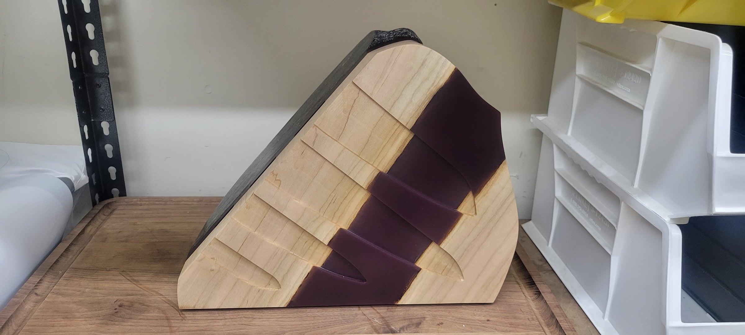 Featuring a rounded design with Maple Wood, this custom rock block is a one-of-a-kind beauty. Made with Purple Resin, it serves as an exquisite home for a 7-piece chef set, marrying functionality with artistic flair. This block is meticulously sculpted from Granite, ensuring unparalleled durability and beauty.