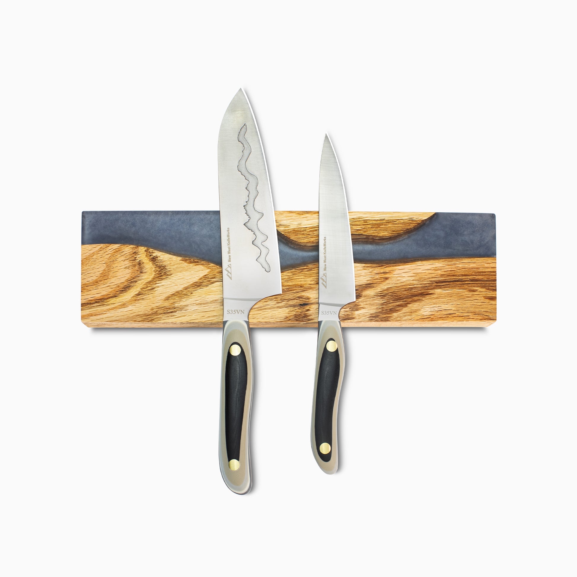 New West KnifeWorks Head of Production, Erin Hemmings, has mastered the art design of mixed media with these magnets. Combining rich, natural wood grain with the vibrancy of cast resin, these knife magnets provide a natural look and feel to your kitchen. This one-of-a-kind magnet can securely hold up to 9 knives on the super-strong magnets encased within.