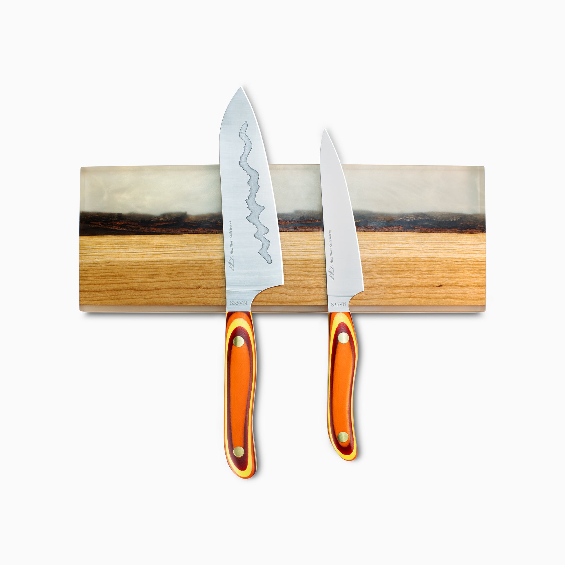 New West KnifeWorks Head of Production, Erin Hemmings, has mastered the art design of mixed media with these magnets. Combining rich, natural wood grain with the vibrancy of cast resin, these knife magnets provide a natural look and feel to your kitchen. This one-of-a-kind magnet can securely hold up to 9 knives on the super-strong magnets encased within.