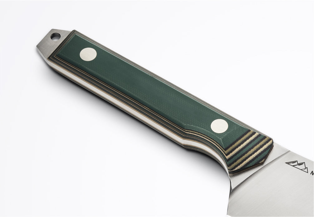 The straight, tactical handle allows for a comfortable, secure grip in many different hand positions- a chef’s pinch grip of the blade, a traditional forward hammer grip, or using a reverse “ice pick” grip for making cocktails or defending camp from invaders.