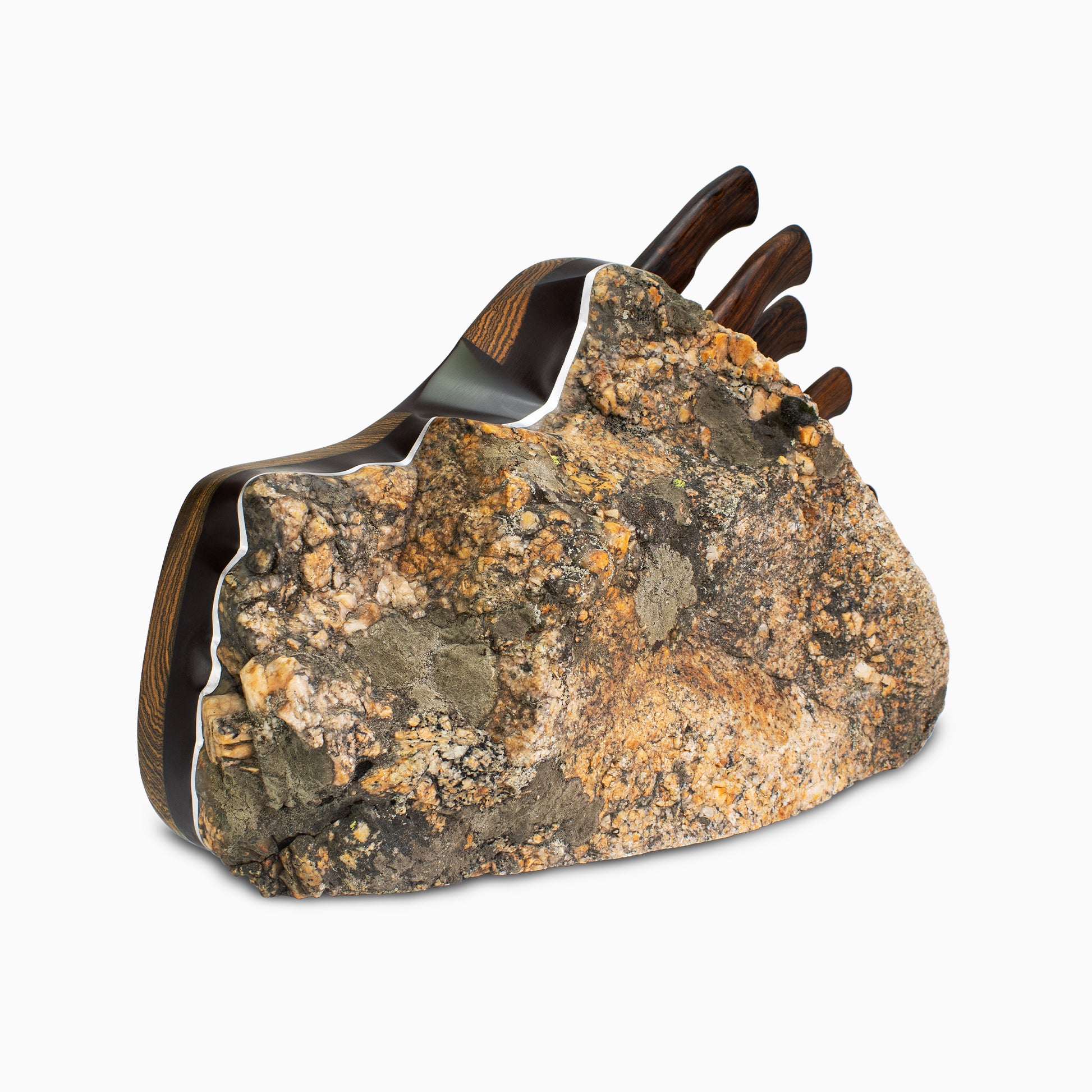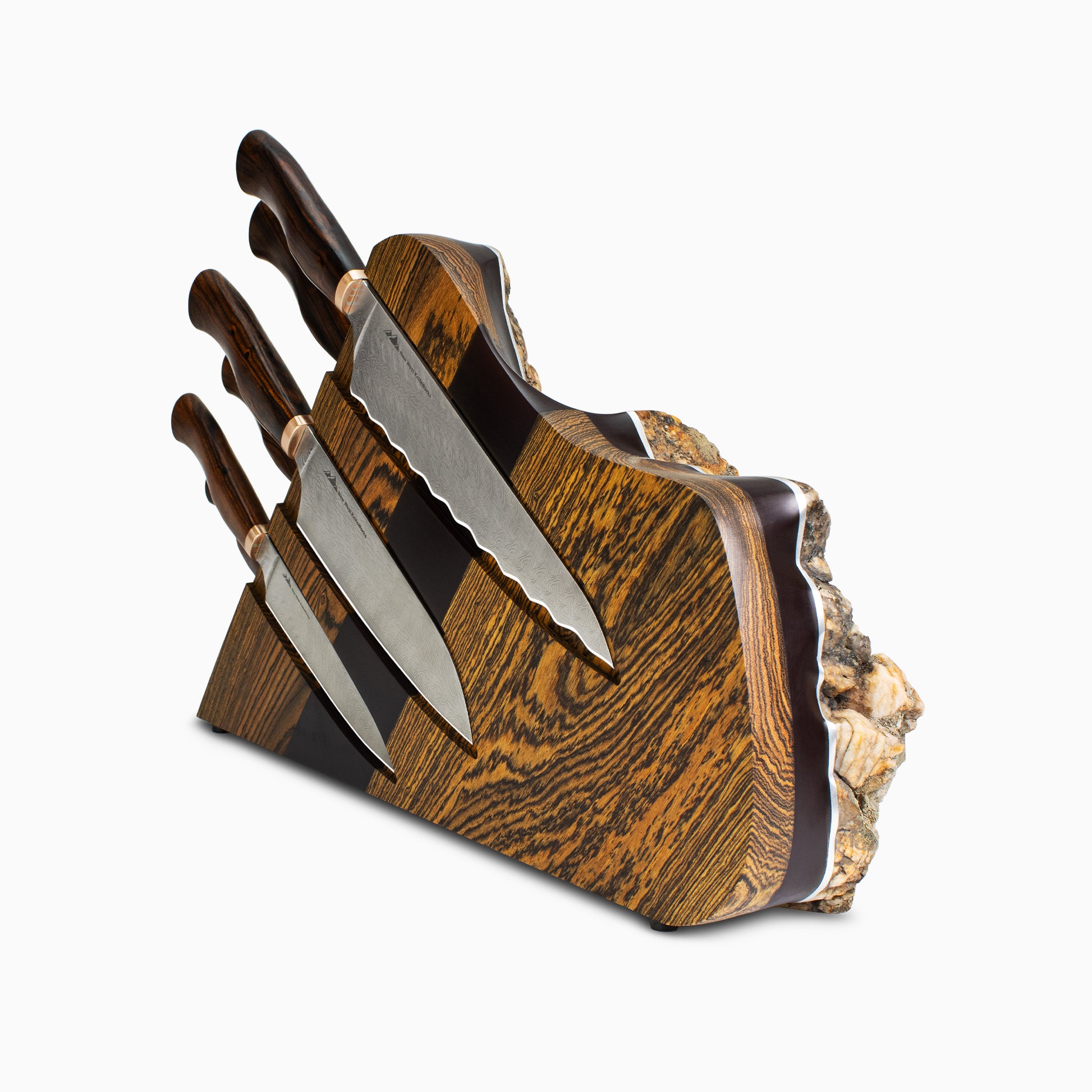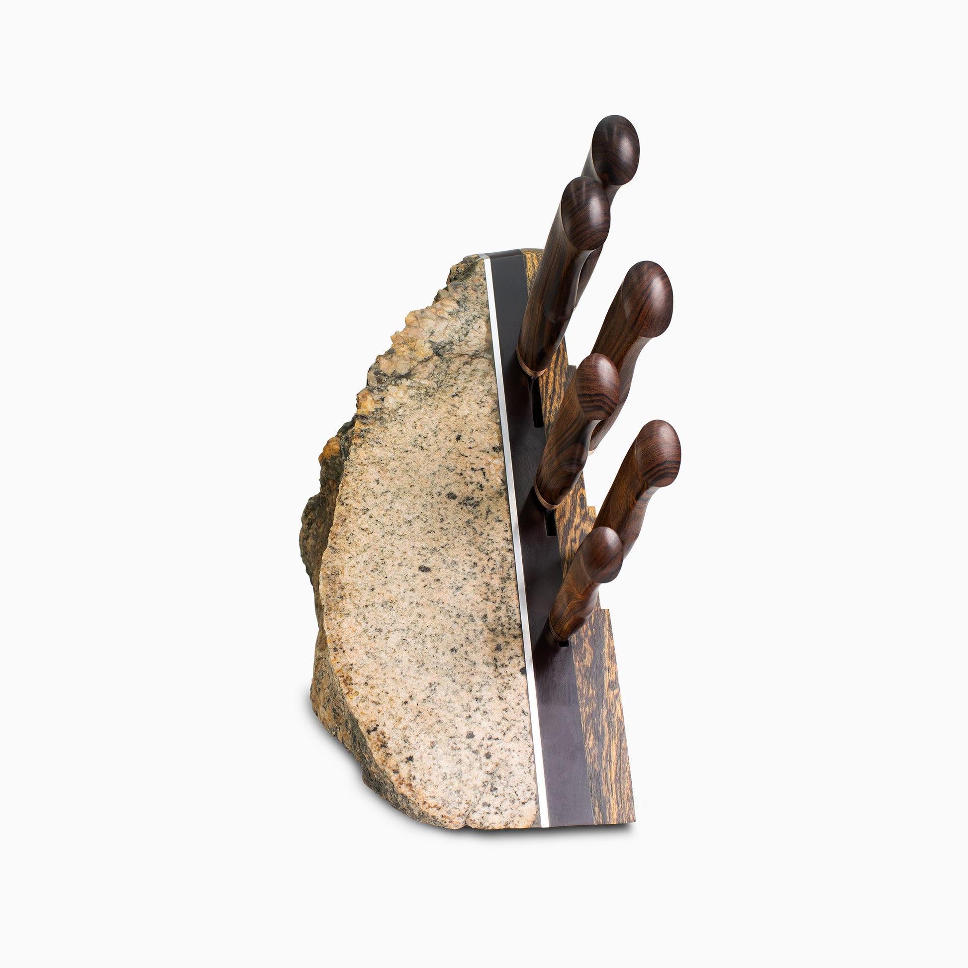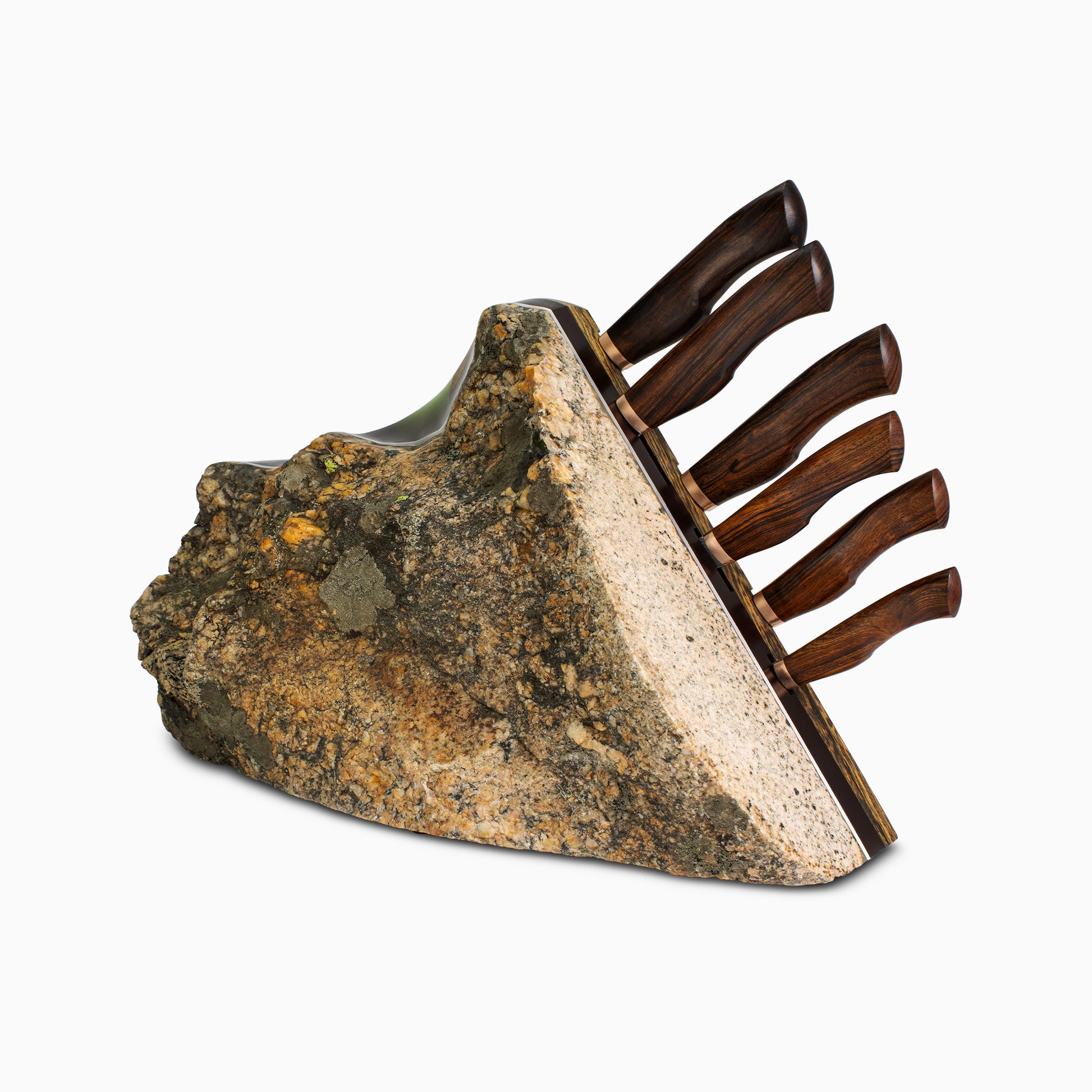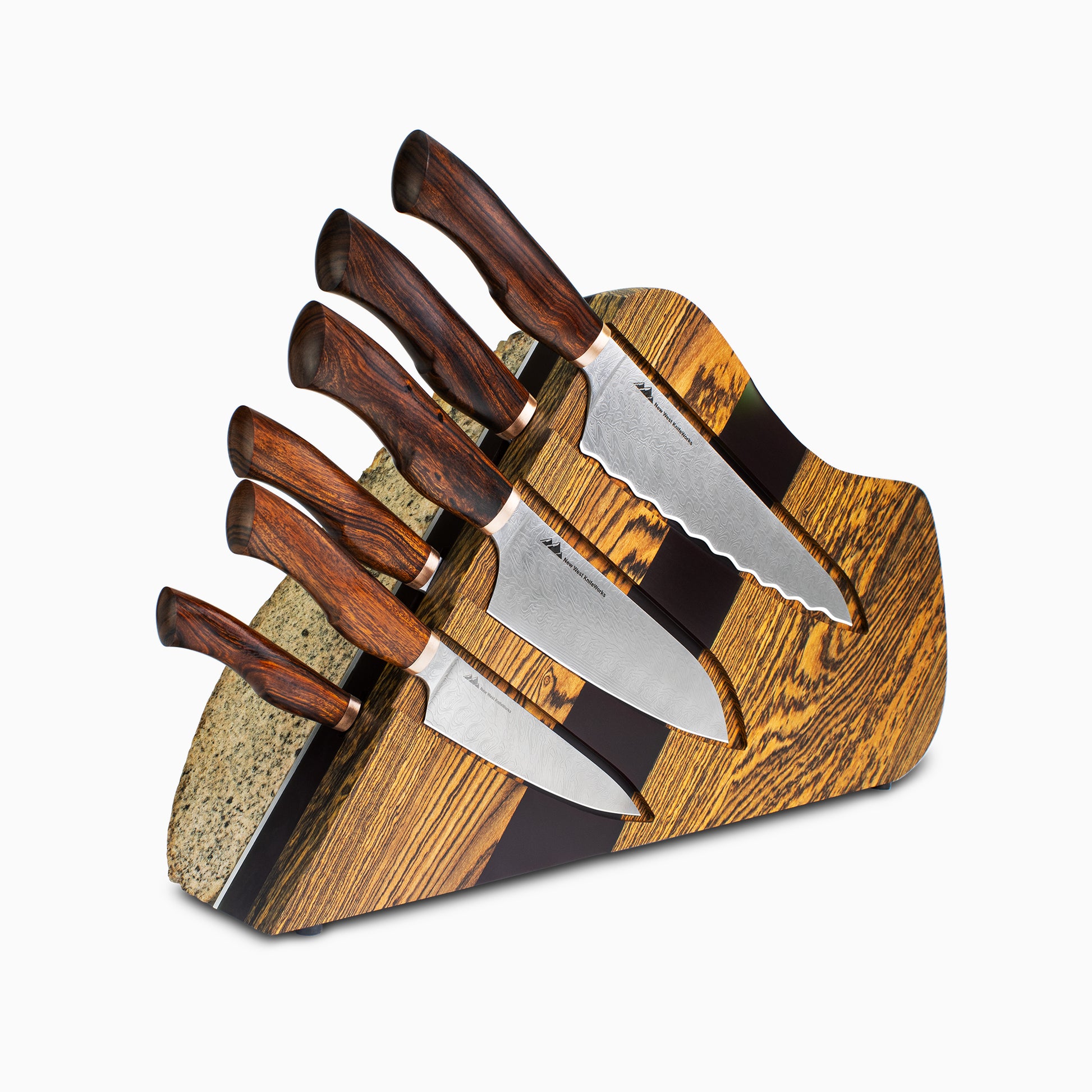 Combining the most advanced steel and design available anywhere in the world, the Uru Chef Knife Set takes the cutting edge to its current limit. Damasteel blades paired with Desert Ironwood handles, this set includes the 9" Superbread, 7" Santoku, 6" Petty, 3" Paring, 9" Chef, and 6" Deli knives housed in the one-of-a-kind Valencia Rock Block. This mixed-media rock block is hand-crafted from Granite, Zebra Wood, Black Resin, and is tied together with a stylish Aluminum band. The stunning and practical vessel will keep your Uru chef knives conveniently at hand while transforming the kitchen into an aesthetic space.
