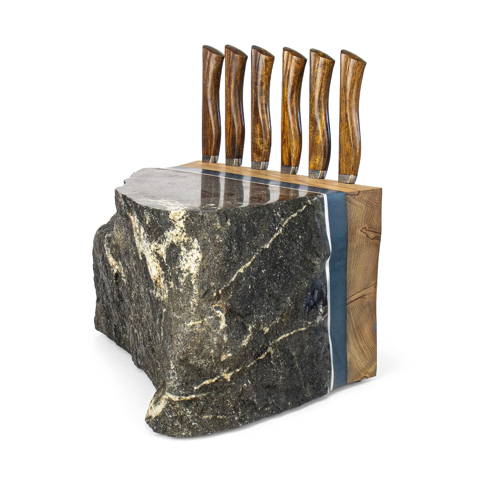 Combining the most advanced steel and design available anywhere in the world, the Uru Steak Knife Set takes the cutting edge to its current limit. Damasteel blades paired with Desert Ironwood handles, this set includes 6 steak knives housed in the one-of-a-kind Kodama Rock Block. This mixed-media rock block is hand-crafted from Granite w/ Quartz, Ambrosia Maple, Steel Blue Resin, and is tied together with a stylish Aluminum accent band. The stunning and practical vessel will keep your Uru chef knives conveniently at hand while transforming the kitchen into an aesthetic space.