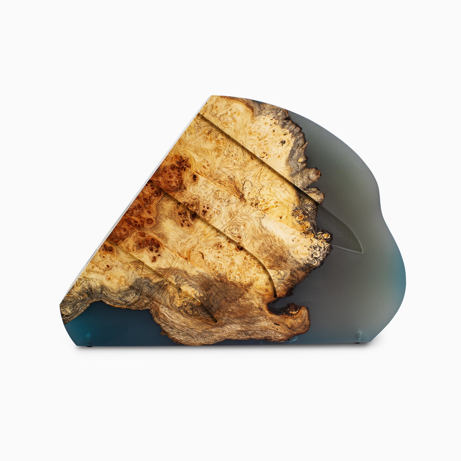 Combining the most advanced steel and design available anywhere in the world, the Uru Chef Knife Set takes the cutting edge to its current limit. Damasteel blades paired with Desert Ironwood handles, this set includes the 9" Superbread, 7" Santoku, 6" Petty, 9" Chef, 6" Deli, and 3" Paring knives housed in the one-of-a-kind Moon Odyssey Rock Block. This mixed-media rock block is hand-crafted from Green River stone, Amboyna Burl Wood, Blue and Grey mix Resin, and is tied together with a stylish Aluminum band. The stunning and practical vessel will keep your Uru chef knives conveniently at hand while transforming the kitchen into an aesthetic space.