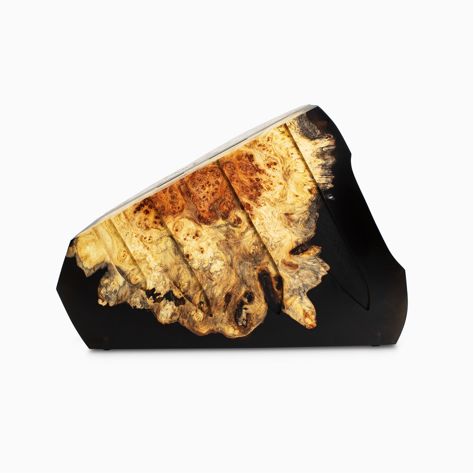 Combining the most advanced steel and design available anywhere in the world, the Uru Chef Knife Set takes the cutting edge to its current limit. Damasteel blades paired with Desert Ironwood handles, this set includes the 9" Superbread, 7" Santoku, 6" Petty, 9" Chef, 6" Deli, and 3" Paring knives housed in the one-of-a-kind Norfolk Pine Rock Block. This mixed-media rock block is hand-crafted from Quartz and Granite stone, Amboyna Burl Wood, Roo Beer Resin, and is tied together with a stylish Brass band. The stunning and practical vessel will keep your Uru chef knives conveniently at hand while transforming the kitchen into an aesthetic space.