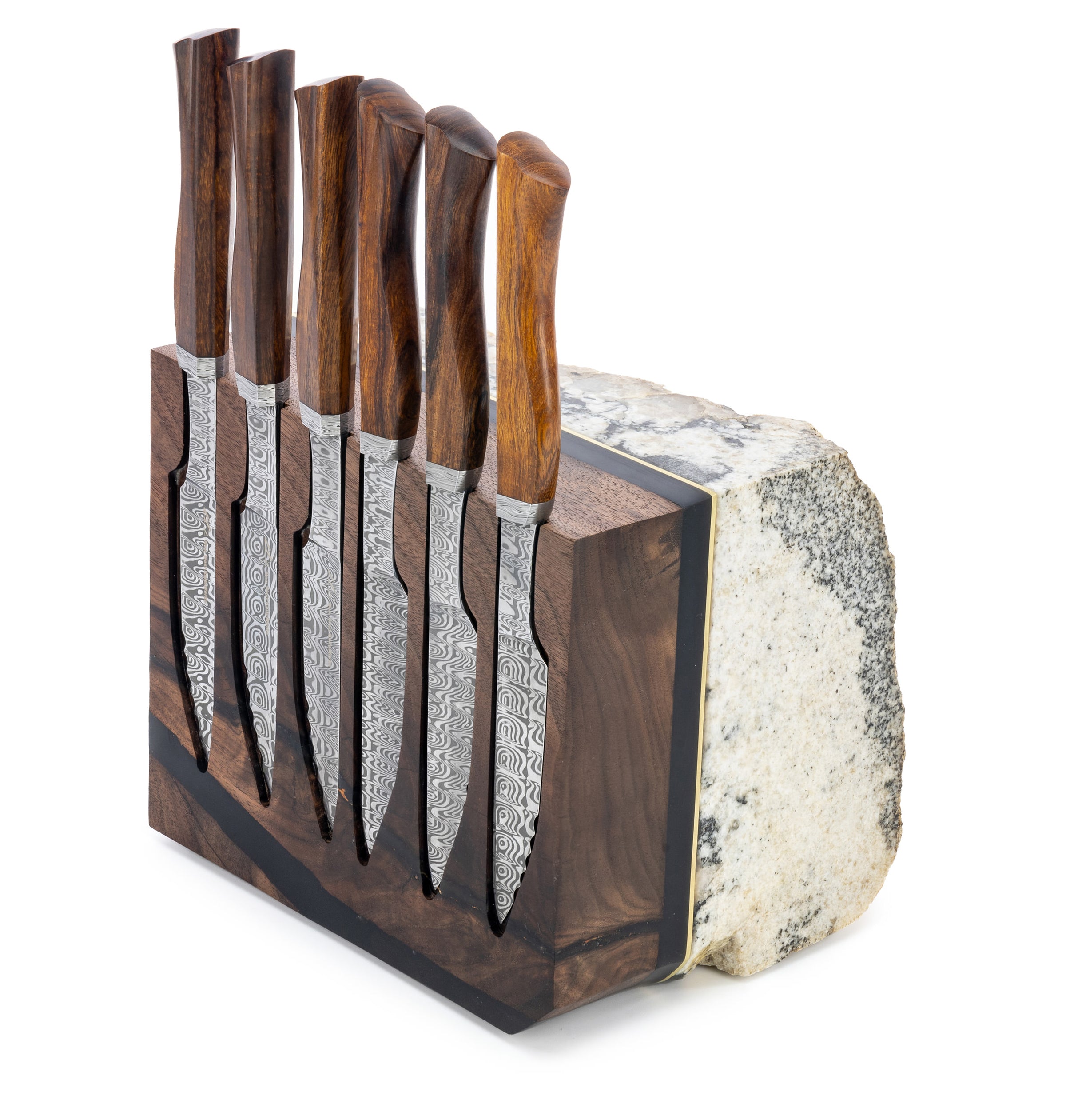 Combining the most advanced steel and design available anywhere in the world, the Uru Steak Knife Set takes the cutting edge to its current limit. Damasteel blades paired with Desert Ironwood handles, this set includes 6 steak knives housed in the one-of-a-kind The Last Waltz Rock Block. This mixed-media rock block is hand-crafted from Granite, Walnut, Black Resin, and is tied together with a stylish Brass accent band. The stunning and practical vessel will keep your Uru chef knives conveniently at hand while transforming the kitchen into an aesthetic space.