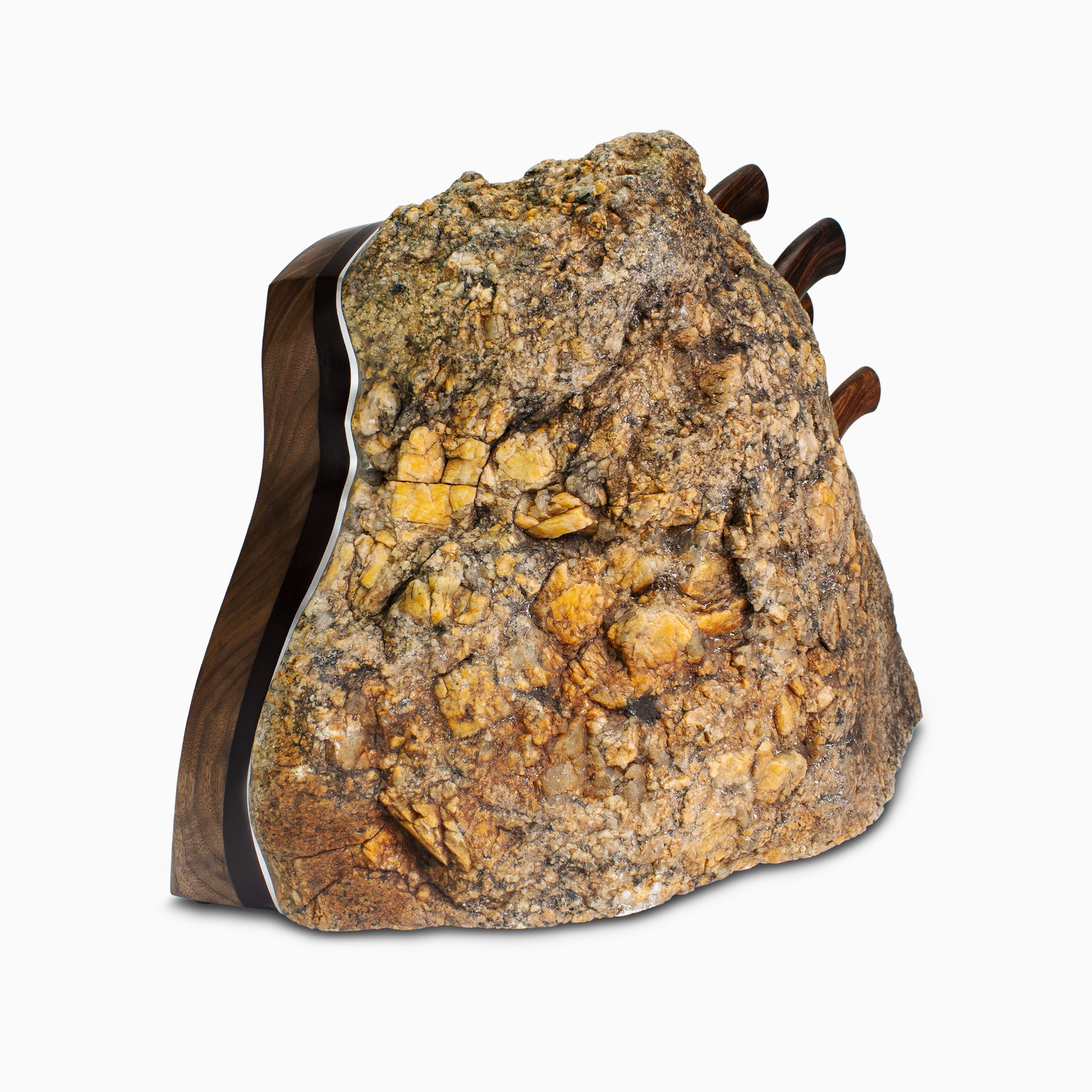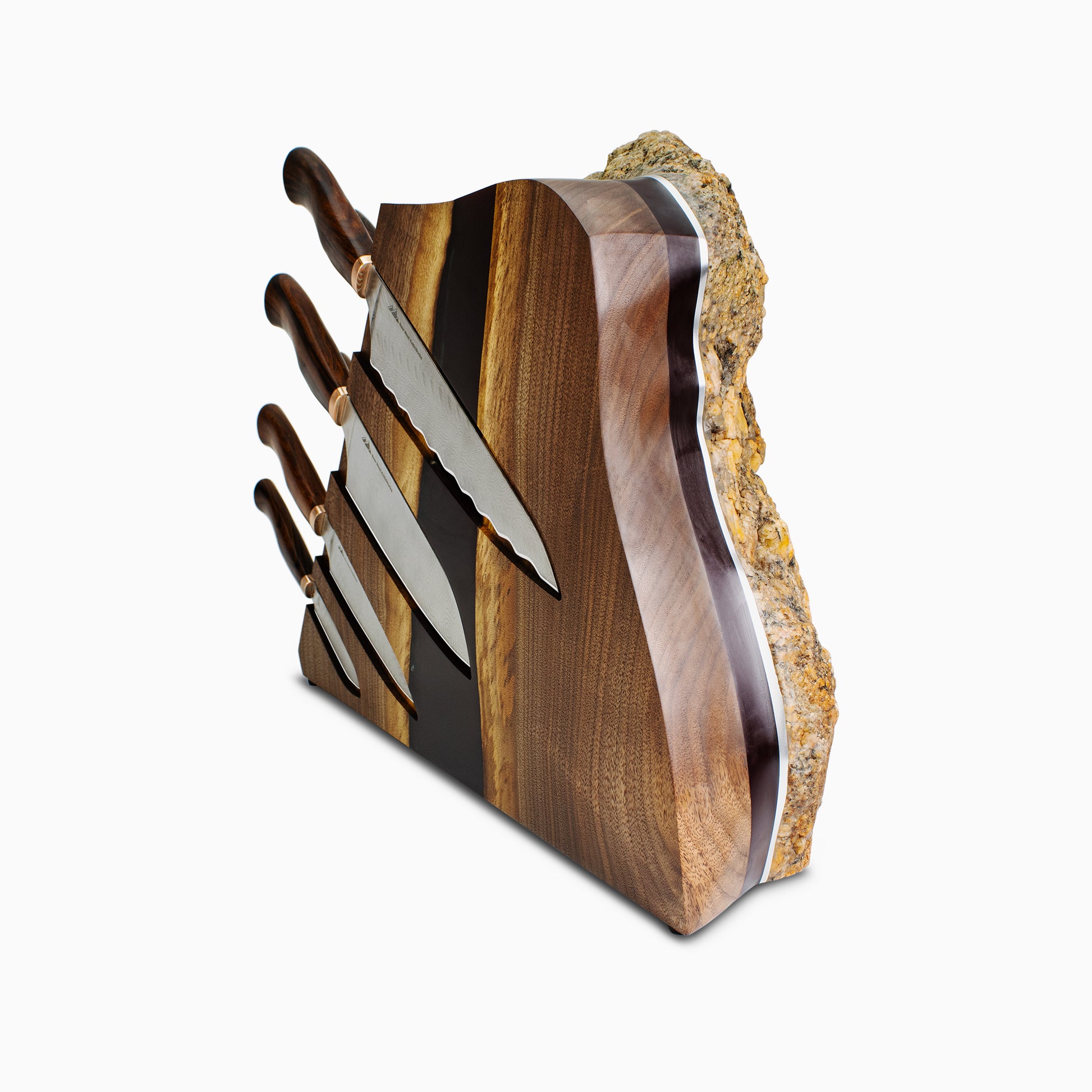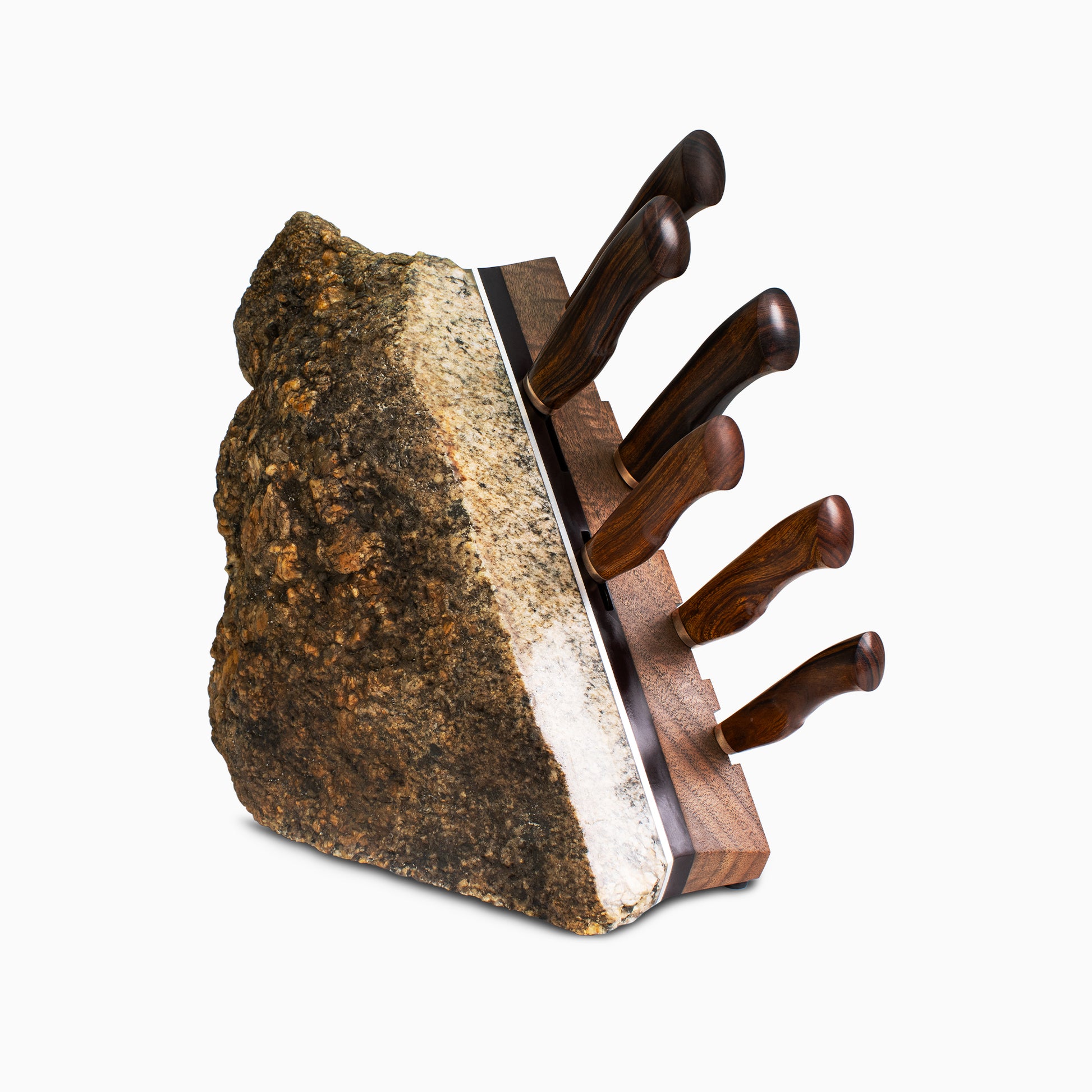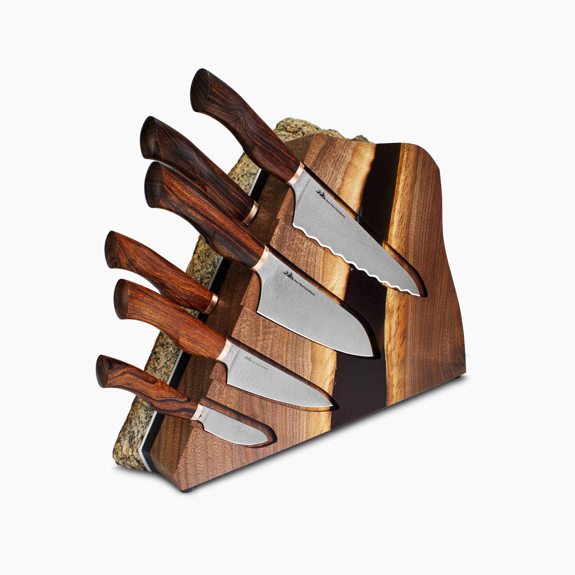 Combining the most advanced steel and design available anywhere in the world, the Uru Chef Knife Set takes the cutting edge to its current limit. Damasteel blades paired with Desert Ironwood handles, this set includes the 9" Superbread, 7" Santoku, 6" Petty, 3" Paring, 9" Chef, and 6" Deli knives housed in the one-of-a-kind Sweet Virginia Rock Block. This mixed-media rock block is hand-crafted from Granite, Walnut Wood, Deep Blue Resin, and is tied together with a stylish Aluminum band. The stunning and practical vessel will keep your Uru chef knives conveniently at hand while transforming the kitchen into an aesthetic space.