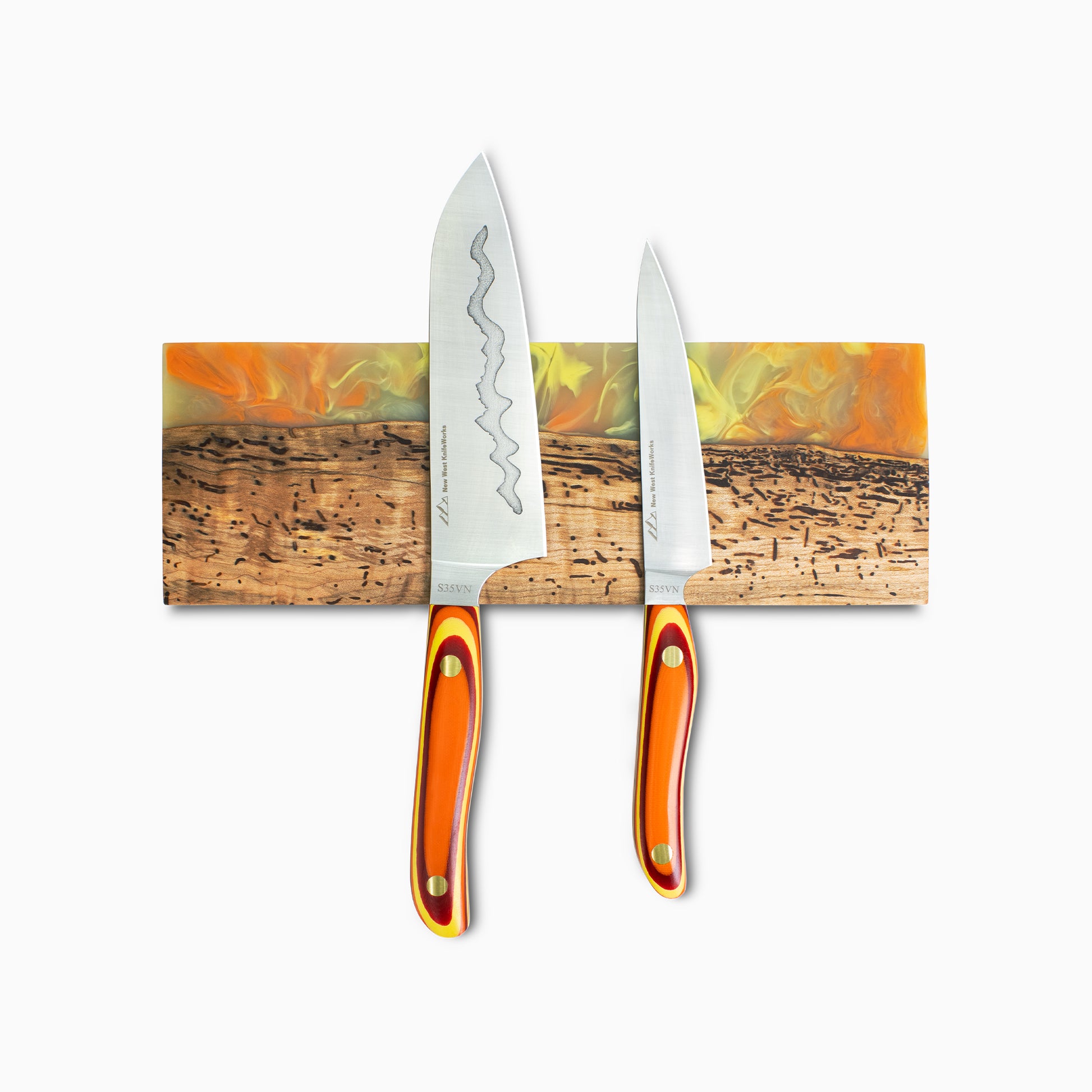 New West KnifeWorks Head of Production, Erin Hemmings, has mastered the art design of mixed media with these magnets. Combining rich, natural wood grain with the vibrancy of cast resin, these knife magnets provide a natural look and feel to your kitchen. This one-of-a-kind magnet can securely hold up to 9 knives on the super-strong magnets encased within.